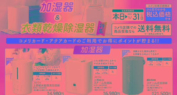 掲載商品一例:加湿器、衣類乾燥除湿器、布団乾燥機など。