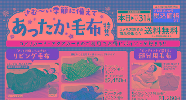 掲載商品一例:リビング毛布、部分用毛布、着る毛布など。
