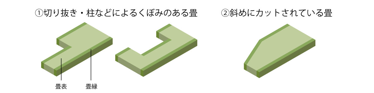 ■切り抜きや斜めにカットされている、柱などによるくぼみのある畳の場合、別途割増料金を頂戴いたします。