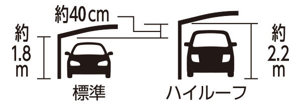 背の高いミニバンやSUV車、キャリア付きの車に最適なハイルーフを設定。