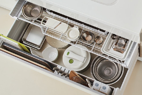 引出し内部を立体的に活用することで収納力を高め、道具の取り出しやすさも向上したアシストポケット・シェルフ。大容量と取り出しやすさを両立した、料理がはかどる収納です。