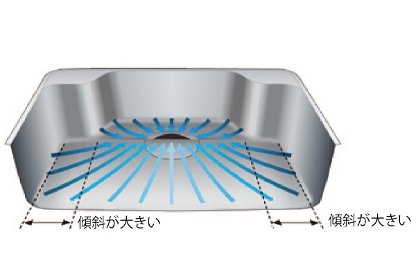 汚れがシンクに戻りにくい構造です。水流の広がりを抑えて汚れを素早く段差に流し込むナイアガラーフロー方式でお手入れ時間も短縮できます。