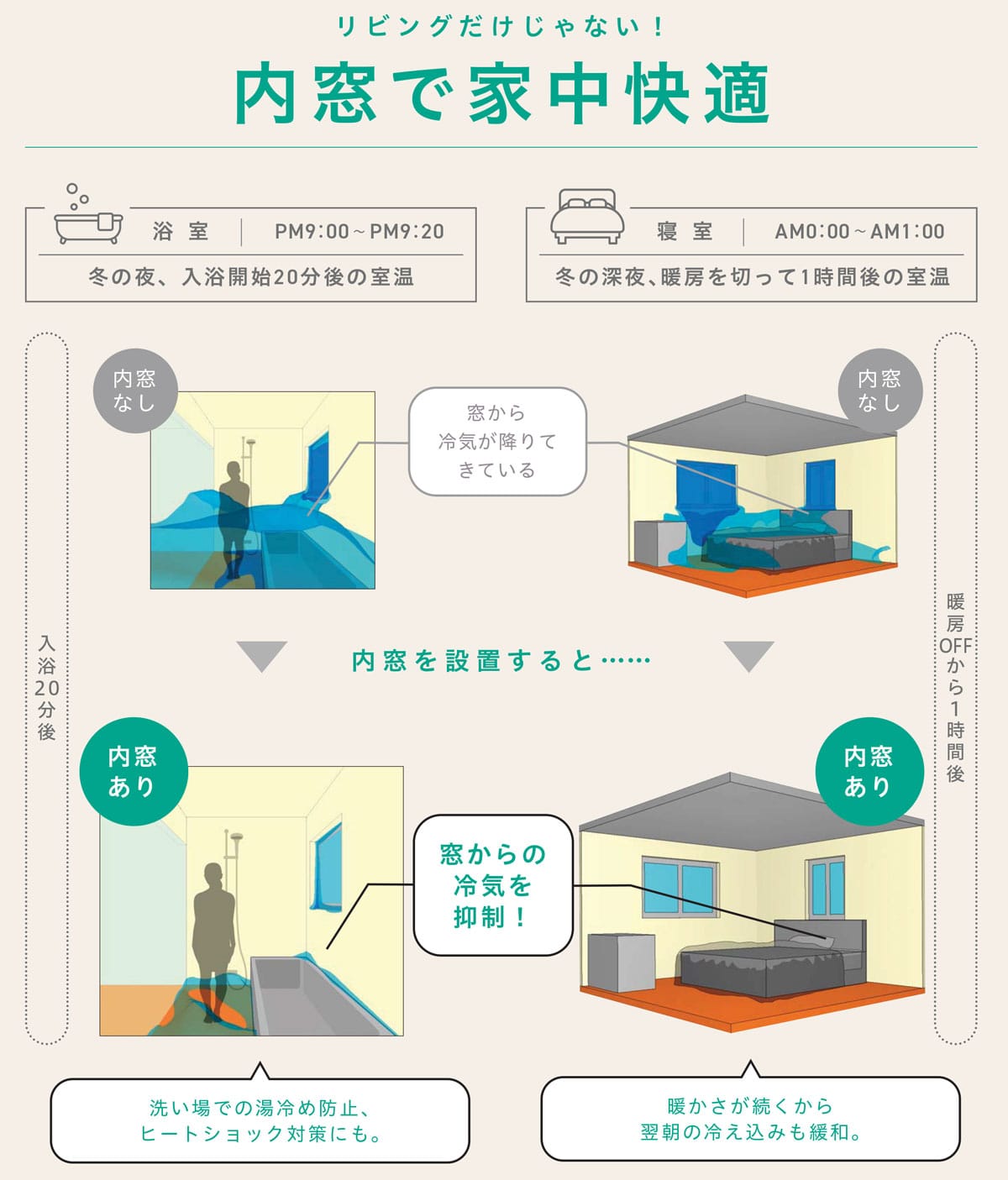 窓は、熱の出入りが一番多い場所。だから、窓の断熱が大切なのです。内窓を取付けて、いまある窓との間に空気の層をつくることで外の冷気がお部屋に伝わりにくくなります。