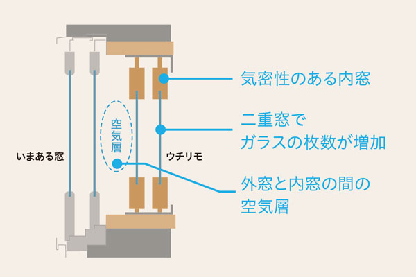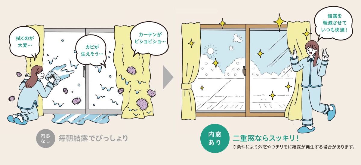 今ある窓と内窓の間にできる空気の層が、窓を冷えにくくして室内側の窓に発生する結露を抑えます。