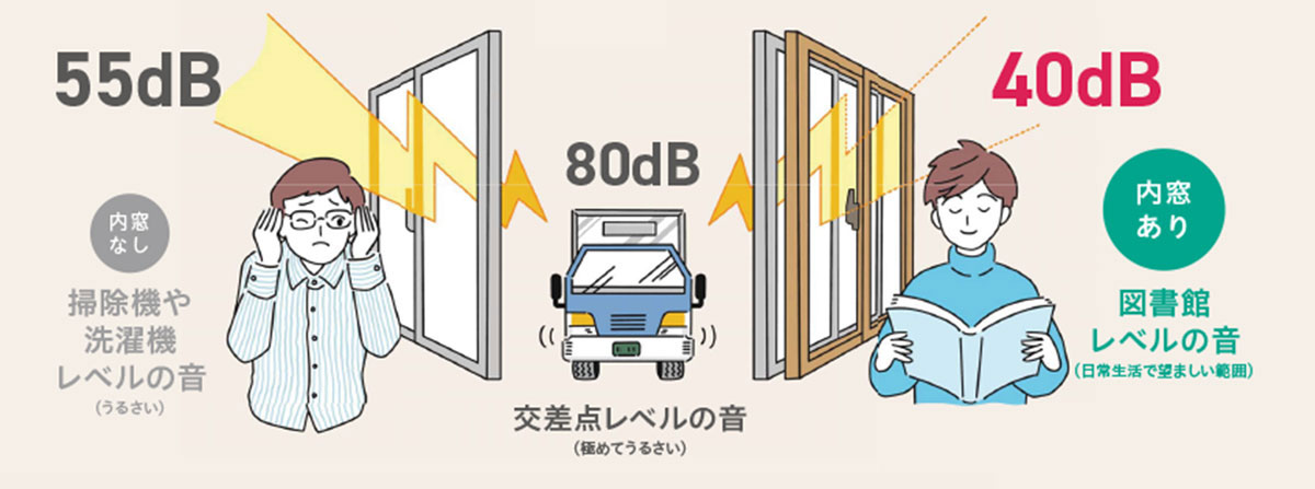 気密性の高い内窓を設置することによって、開口部の気密性が増し、遮音効果を高めます。また、二層の窓間の空気層によって、音の伝搬が絶縁されるため、単層の窓の質量を増加するよりもはるかに遮音効果を高めることができるのです。
