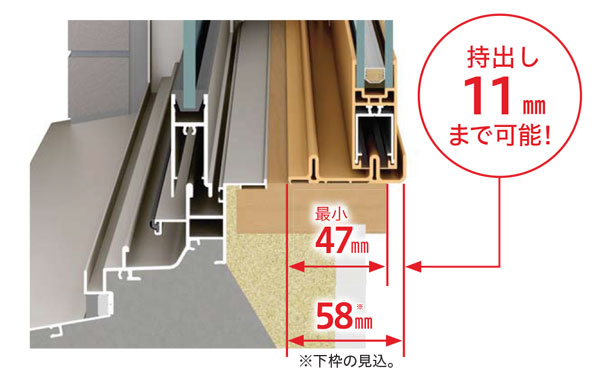 「ウチリモ」は枠見込58mmの薄型設計を採用。さらに枠持出し納まりにより、額縁取付寸法が最小47