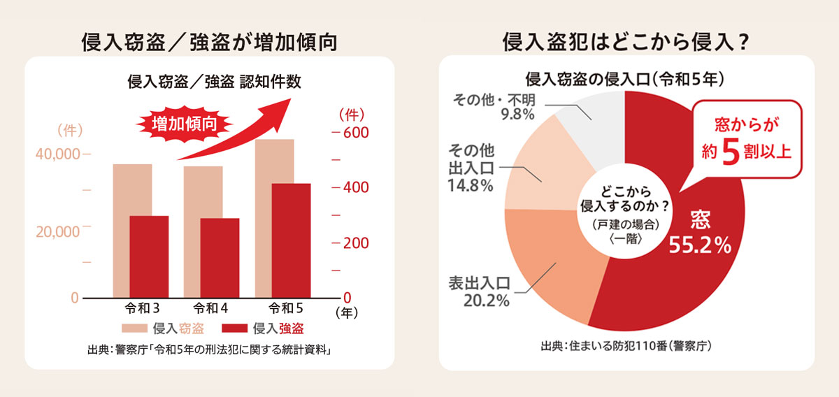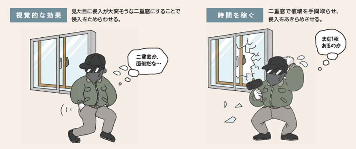 泥棒は開けるまでに時間がかかる窓が大嫌い。二重窓にするだけで、泥棒に侵入をためらわせる効果が期待できます。