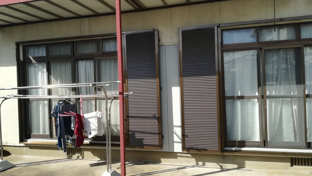 今までの雨戸が古くなり、サッシとの取付部分から雨水が侵入してくるので不安とのことでした。既存の木製よりも開け閉めが楽なアルミサッシ雨戸と、併せて外壁の補修も提案させていただきました。