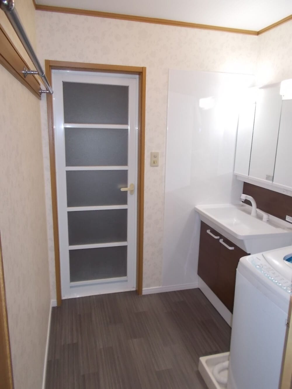 長年使用してきた洗面台の交換と一緒に内装のリフォームもしたいとのことでした。洗面台の交換に併せて水撥ねする部分へキッチンパネルを張ることを提案させていただきました。