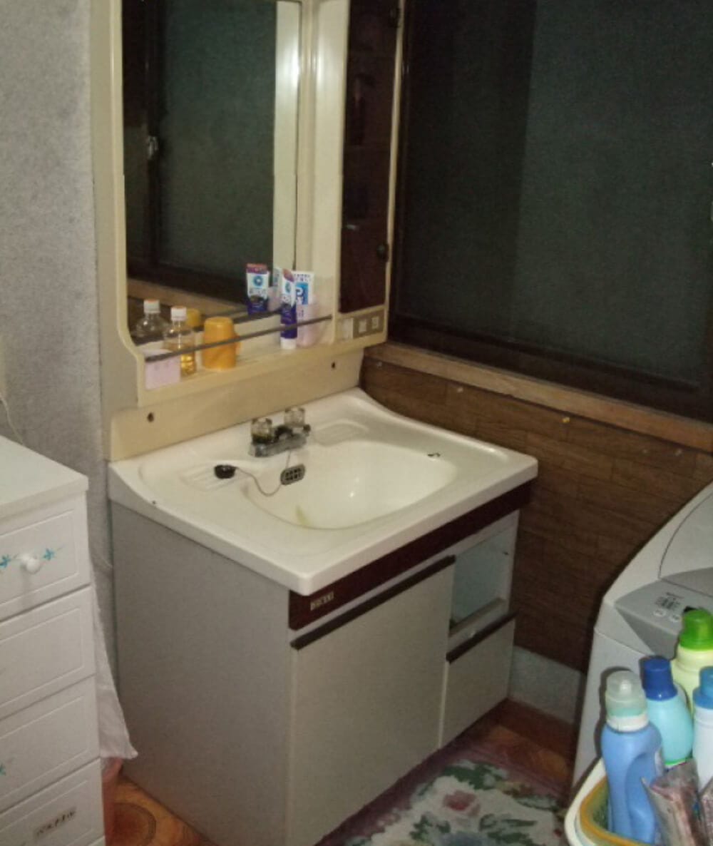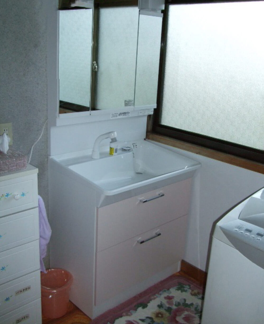 洗面台を新しくして壁紙も汚れが目立っているのできれいにリフォームしたいとのことでした。水撥ねする部分には水に強いキッチンパネルの取り付け、洗面台は収納力の高い2段引き出しタイプを提案させていただきました。
