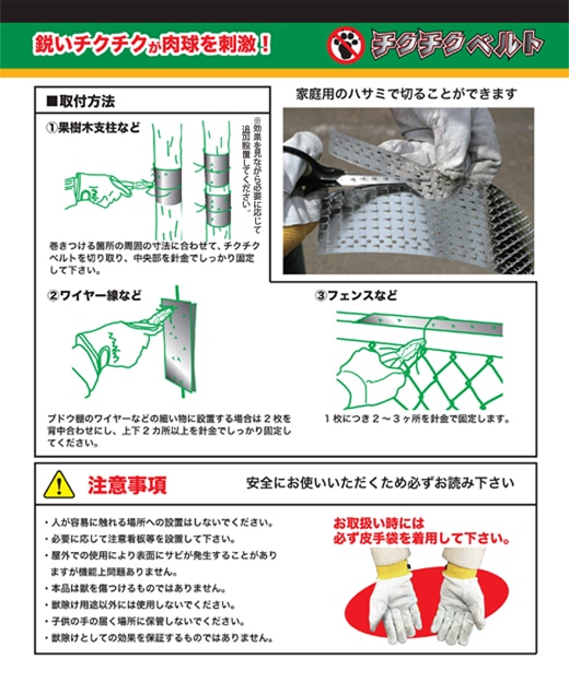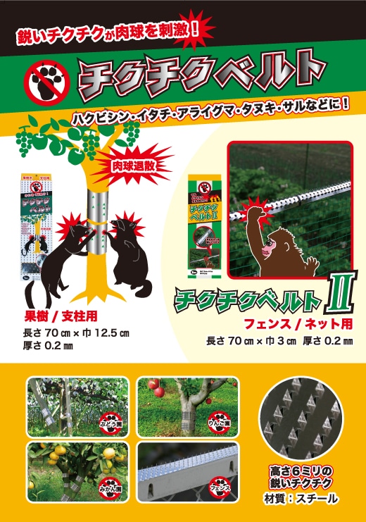 果樹園等でのハクビシン・アライグマ・イタチ・タヌキ等の小動物の農作物被害は急増しています。これらの小動物は「登る」ことが得意で、果樹木・果樹棚・支柱などを伝わって侵入し、食害を及ぼすことが多いようです。対策としては、これらの侵入経路から「登らせない」ことができれば、食害の軽減が可能であると考えられます。