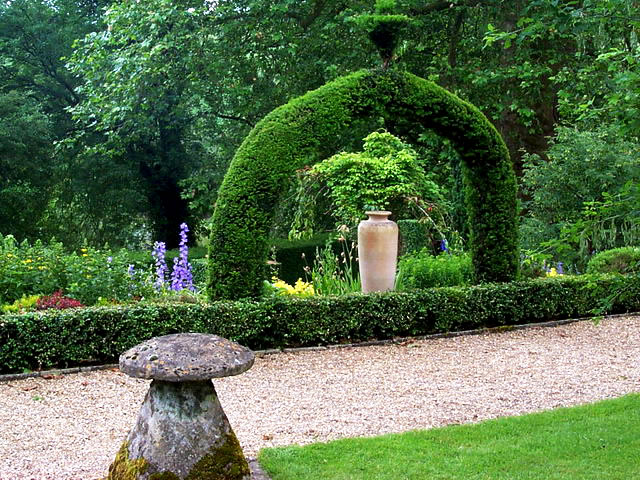 この3枚の写真は英国の友人の庭で撮ったものです。トピアリーの下にあるアンティークのテラコッタの鉢がすばらしかったからです。