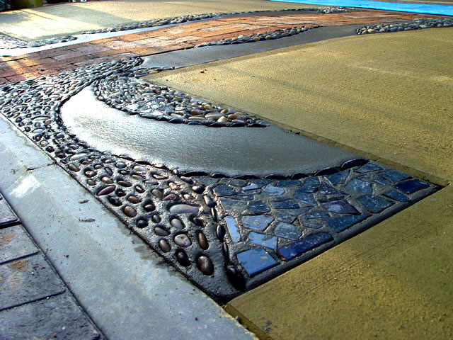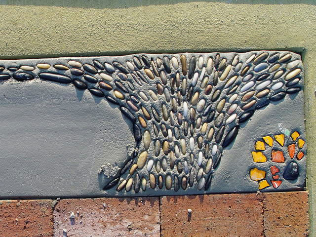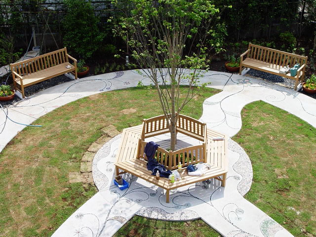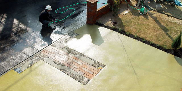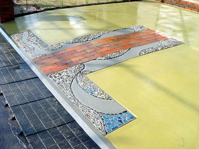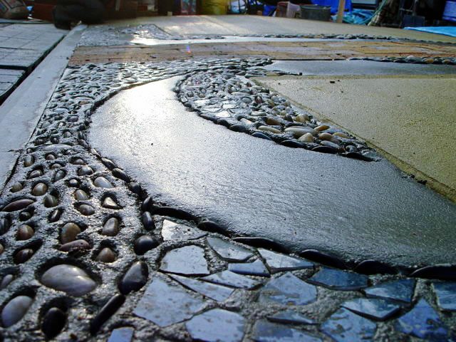 最近施工の建売住宅(広島で、10棟分をブリティッシュスタイルにということでデザインしました)のガーデンエクステリア施工時のもの。私たちで駐車場とアプローチに施したモザイク施工ですが、いくつかのアングルから撮ったものを比べてみましょう。