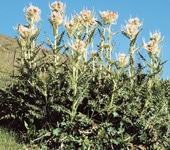 | ヨーロッパのアルプスやアペニノ山脈に分布する、キク科アザミ属の多年草。高山の草地。H20〜120cm。羽状で棘の多い鋸葉。7〜8月頃、黄白色の頭状花を咲かせる。 |