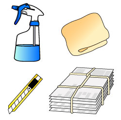 ・霧吹き ・タオル ・カッターナイフ ・古新聞
