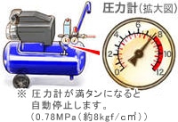 6.満タンになると自動停止します。これでエアーツールを使うことができます。圧力計の目盛りが0.59MPa(約6kgf/cm²)まで下がると、再びモーターが動き出し空気をためます。