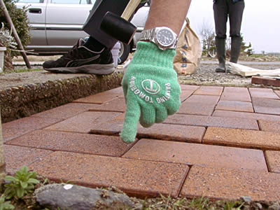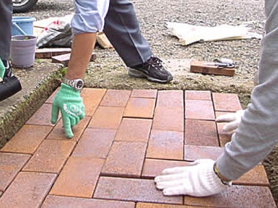 端の方からレンガを敷いていきます。敷いたのちに動かないように、「そっとギュッと」敷き詰めましょう。