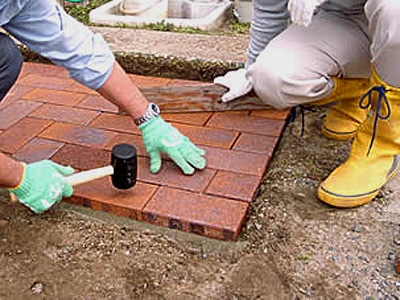 ただし、叩きすぎには注意!周囲のレンガと良く見比べて、全体が平らになるように確認しながら作業を進めましょう。1回で締めようとせず、何回も叩いて様子を見ます。