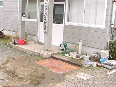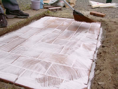 袋を開け、ホウキを使ってレンガの目地全体に入れ込んでいきます。すきまがしっかり埋まるよう丁寧に作業をして下さい。あと一息!