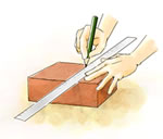 定規でしっかりと墨付け(線引き)をします。レンガの表面はザラザラしているので、芯が柔らかい鉛筆を使うとよいでしょう。上下前後の4面をグルッと回るように線を引きます