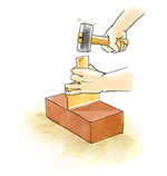 レンガタガネを線の上に垂直に当てて、ハンマーで軽くたたいて跡をつけます。まっすぐに割るための準備なので、この段階で力を入れる必要はありません。線の上をなぞって溝を掘る感覚で、墨付けをした4面すべてに対して行います。硬いコンクリートの床の上ではなく、木の板や砂地の上で叩いていくのがよいでしょう。