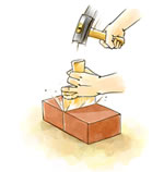 溝に対して垂直にタガネを立てて、エイッ!と一気にハンマーで叩き込みます。1回で割れなければ、カンカンカン・・・と何回か叩いてみましょう。うまくいけば手順2で掘った溝に誘導されて、レンガをきれいに割ることができます。