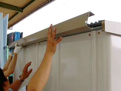 さぁ、いよいよ屋根の取り付けにかかります。コメリ特選物置では屋根は波状の形をした鋼板。これを数枚、横に重ねあわせながら屋根としていきます。
