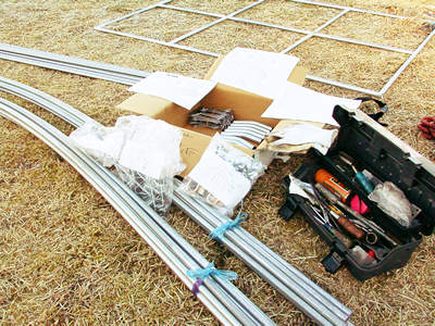 まずビニールハウス組み立てのセット※1を一式広げて内容物を確認します。セットには骨組みとなるパイプ類はもちろん、パイプ同士をつなぐジョイントやビニールを押さえる器具も完全に揃っていて、頼もしい限りです。
