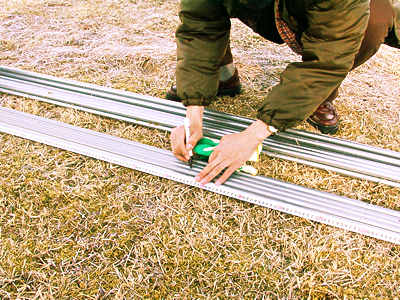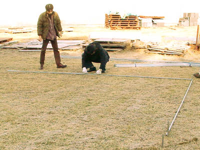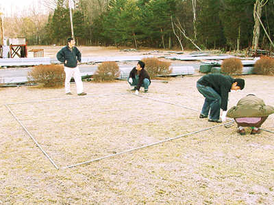サイズが決まるとすぐに準備作業開始!地面にベースとなる『直管パイプ』を置いていくことが最初の作業となります。ここで気をつけるのは、「パイプが直角に接するキチンとした四角形を作る」ということ。小学校の時間に習った「三平方の定理」を持ち出して、「直角を構成する辺の2乗を足すと、対辺の長さに等しくなる」というあの理論で四角形を作っていきます。