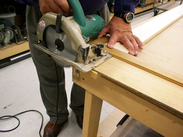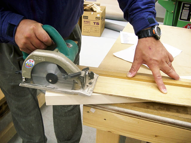 木取り図のように、合計19個に切り分けます。丸ノコ定規を使って、まっすぐに切ります。(写真の丸ノコ定規は手作りのものです。)