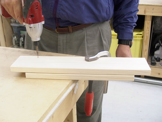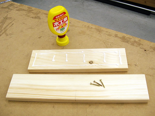 Fの片面に接着剤を塗って、Iを貼りつけます。C型クランプで固定して、ビス止めをします。