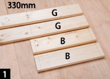 G2枚の両端からそれぞれ330mmのところに線を引き、線上に下穴を2カ所あける。B2枚は両側に板厚1枚分の線を引き、板厚の中心に下穴を2カ所ずつあける。