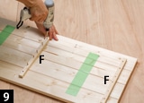 両端40mm(上下のあきは均等に33mm)、中央にFを置き、下穴をあけて25mmスリムビスで6カ所留める。