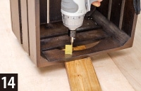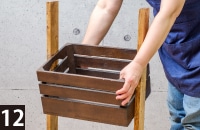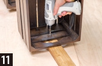 ガーデンBOXを脚の上に置き、電動ドリルで同時に下穴をあける。脚の裏側まで貫通しないよう、ドリルの先20mm程度のところにマスキングテープを巻き目安にする。