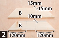 B の中央(両端からそれぞれ120mm)にA を置き、板幅分の線を引いたら、下穴の印をつける(2枚分は端から10mm、2枚分は端から15mm)。