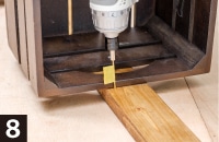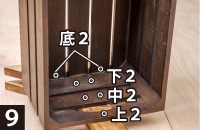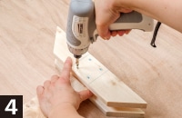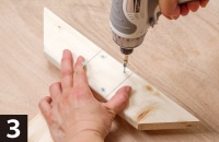 次に写真の位置を参考に下穴(上1、中2、下2、底2)をあけ、30mmのスリムビスを留める。裏に返し、もう1本の脚も同様に留める。