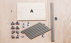 A の板を床に置く。バランスを見ながら9の上部を重ねて置いたら、サドルを4カ所にトラスタッピングネジで取り付ける。