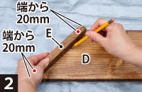 D の斜めの辺にE を置き、周りを鉛筆でなぞる。両端20mmの位置にビス穴の印をつける。