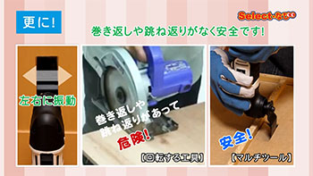 - マルチツールは左右に振動するタイプで回転する工具で起きる巻き返しや跳ね返りがなく安全です!