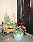 ・陶器鉢・みずき・オタフク南天・セイヨウイワ南天・プリムラメラコイデス・ユリオプスデージー・アリッサム主木のみずきは、丸くて大きな葉がつきますが、落葉した後の幹が赤く、きれいです。その他にモミジ、ピラカンサス、ひいらぎ南天なども和風の材料になります。桜草のイメージを出すためにプリムラメラコイデスを、黄色が入ると明るく、春らしくなるのでユリオプスデージーを。これらは伸びるのが早く、花が上の方につくので、準主木としても使えます。バランスを見ながら位置を決めます。根元の白いアリッサムは、育つにつれ、こんもりと広がっていきます。