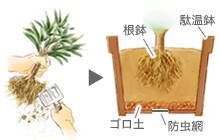 鉢から株を抜き、根を切らないように根土を半分ほぐし、根を広げて1回り大きい深鉢に植え付けます(駄温鉢が最適)。植え付け用土は、鹿沼土4:腐葉土2:ピートモス4の割合にします。植え終わったら、鉢ぞこから流れるほどたっぷりと水を与えます。そして、直射日光と風の当たらない場所に置きます。
