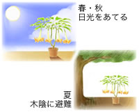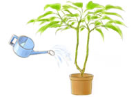 春から秋の生育期間には枝葉が茂り、水分を多く必要とします。水切れをおこすと、花芽が落ちたり、ハダニが発生しやすくなりますので、天気の良い日は1日1回与え、夏は1日2回与えます。庭植えは、ひどく乾いた時のみ与えます。