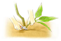 5〜6月、茎の地際から出てきた芽をそのまま放置すると、中心となる茎の生長が悪くなったり、樹形がくずれたりするので、芽かきをしましょう。