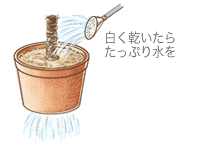 植え穴と同じ大きさに、水が流れ出さないように土を盛り水鉢を作ります。水を十分に与え、水が引いたら支柱を取り付けます。 |