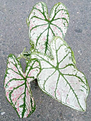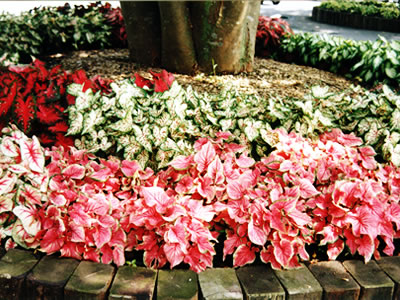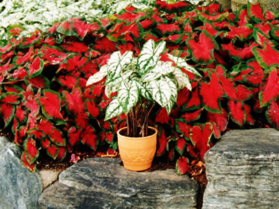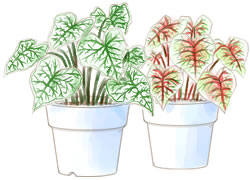 意外と種類のあるカラジューム。各々の種類の特徴を生かして夏の花壇演出をどうぞ。