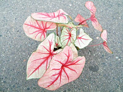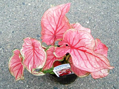 サトイモに似た細長いハート型の、赤や白などの美しい植物です。鉢植えで観葉植物として楽しむ他、夏の花壇や、寄せ植え、ハンギングバスケットにも利用できます。熱帯アメリカに原種が約15種分布しています。1700年代の半ばブラジルで発見され、ヨーロッパへ渡ったのちに品種改良もすすみましたが、次第に人気が衰えました。今世紀では、アメリカで人気が高まり、現在球根の大量生産を行っています。