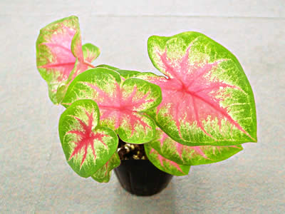 フレイダヘンペル 葉の周辺が緑で、中の赤がとてもよく映えます。赤系のカラジュームの中でも使いやすいです。 |