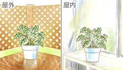 葉のある時期は、日当たりであれば、葉の色がはっきり美しく出ますが、日陰では、葉が徒長し姿が乱れて葉の色が退色します。夏に花壇に植えられるほどに、日当たりでよく育ちます。ただ、日陰で育てていたカラジュームを急に夏の直射日光に当てると、葉焼けをおこしやすいです。その場合は、徐々に日に当てて慣らしてから、直射日光に当てるようにします。