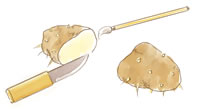 球根植えつけの裏技葉が1本勢い良く出たけど、市販されているカラジュームのように葉が沢山でないのはどうしてかと疑問に思った事がありませんか。生産する農場では、球根の芽をえぐり取り、そのまわりから芽を複数出しています。