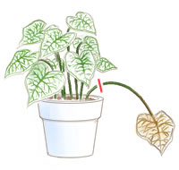 1.カラジュームは春植え球根ですので、4月頃植えます。大きな球根の場合、2つにカットして植えます。切り口にベンレートの粉末をつけ、腐敗防止をします。